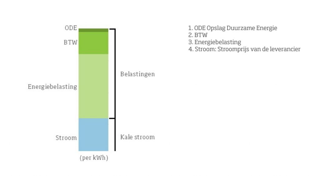 De prijs van stroom bestaat uit een aantal onderdelen, naast de kosten voor de kale stroom betaal je per kWh ook belastingen: