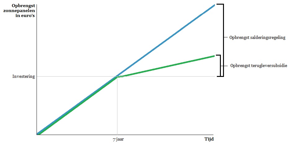 De nieuwe terugleversubsidie wordt zo berekend dat je na 7 jaar je zonnepanelen terug hebt verdiend. Na die 7 jaar stopt de subsidie. Je ontvangt dan alleen nog de prijs voor jouw opgewekte de kale stroom per kWh . Zoals je hieronder kunt zien, is hierdoor het rendement van jouw panelen daardoor aan het einde van de levensduur lager bij de terugleversubsidie dan bij de huidige salderingslevering.